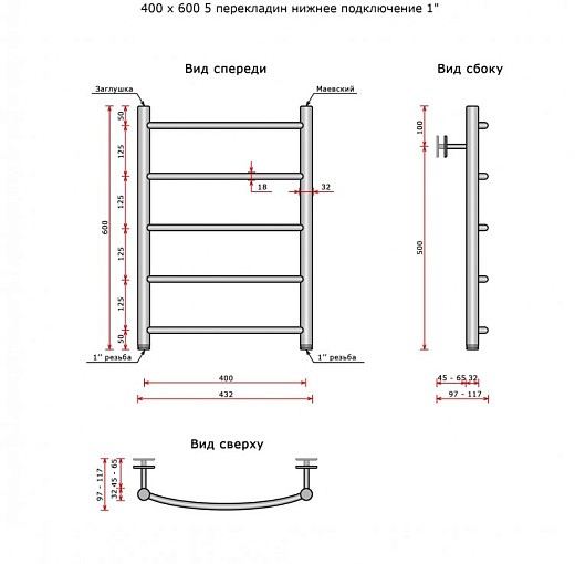 Полотенцесушитель водяной Ростела Соната (нижн.подв., 1" резьба) 400 х 600 / 5