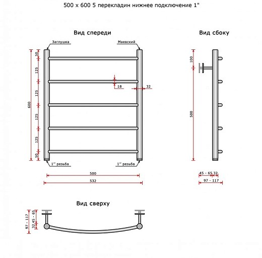 Полотенцесушитель водяной Ростела Соната (нижн.подв., 1" резьба) 500 х 600 / 5