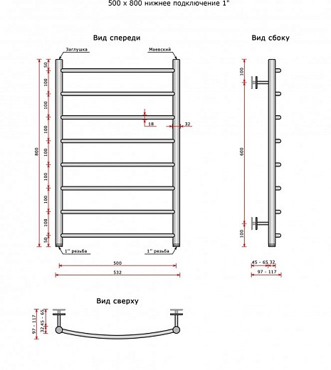 Полотенцесушитель водяной Ростела Соната (нижн.подв., 1" резьба) 500 х 800 / 8