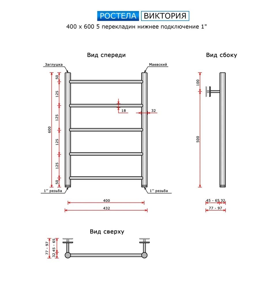 Полотенцесушитель водяной Ростела Виктория (нижн,подв, 1" резьба) 400x600 / 5 Ral 9005 чёрный