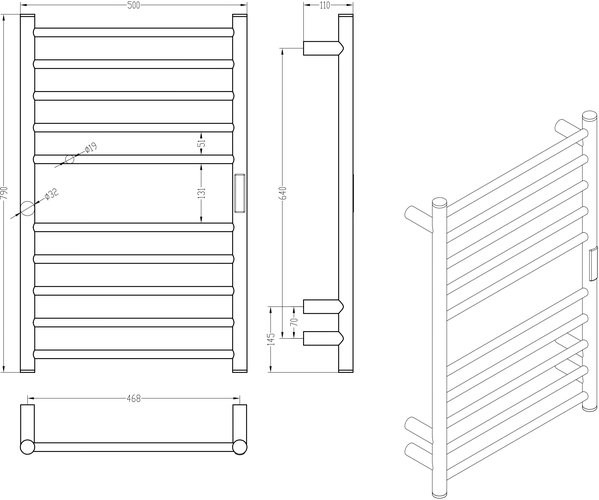 Электрический полотенцесушитель с прямой формой лесенки и 10 перекладинами, выполненный из нержавеющей стали AISI 304 толщиной 2 мм. Мощность 108 Вт, напряжение 215 - 225 В, частота 50 Гц. Имеет боковое и скрытое подключение к электросети, регулируется таймером на 1-9 часов и терморегулятором с тремя режимами температуры 45, 50 и 55 градусов.