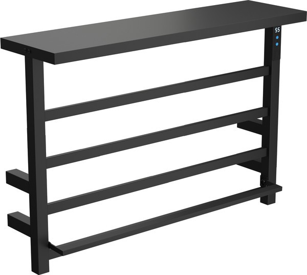 Электрический полотенцесушитель с квадратным профилем и двумя полочками - верхней большой и нижней откидной. Изготовлен из прочной углеродистой стали толщиной 2 мм с матовым черным покрытием, устойчивым к отпечаткам и повреждениям. Мощность 60 Вт, напряжение 215 - 225 В, степень защиты IP44.