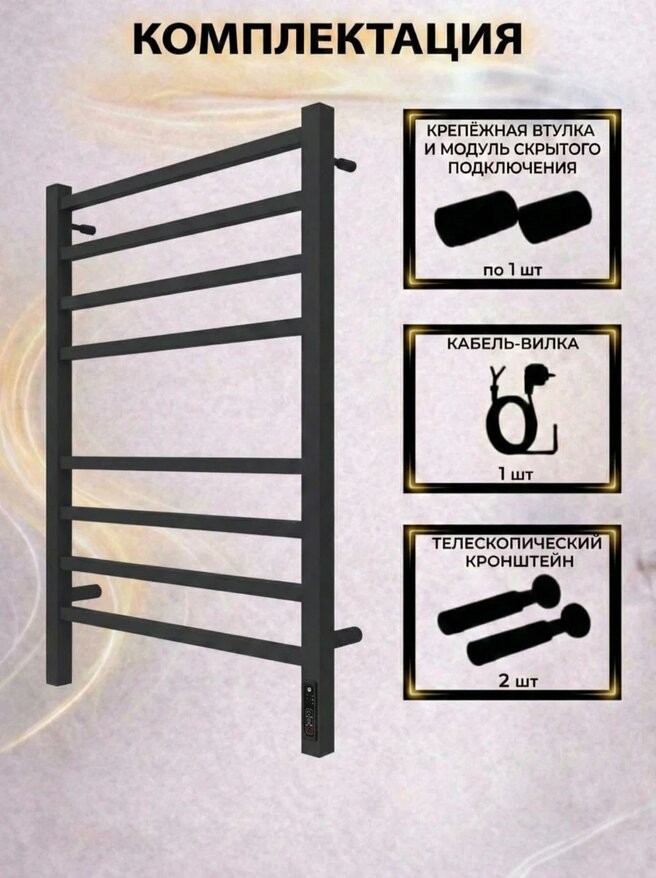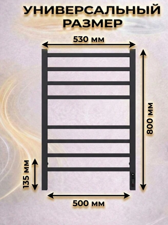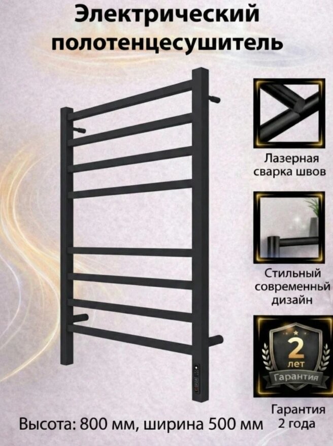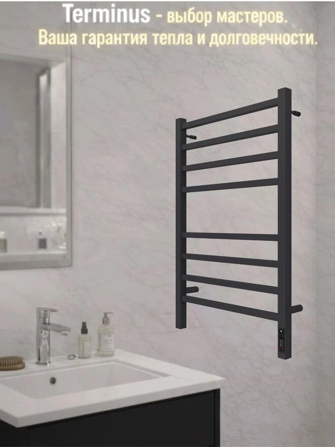 Полотенцесушитель электрический Terminus Ватикан КС П8 500x800 черный c терморегулятором quick touch. Выполнен из конструкционной стали.
