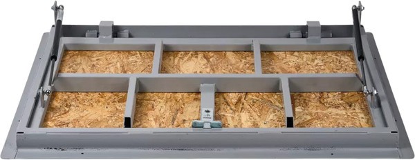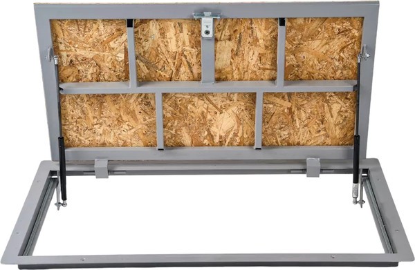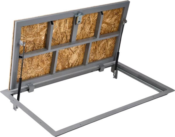 Ревизионный напольный люк Погребок ОСБ оснащен газовыми амортизаторами и предназначен для обеспечения доступа к инженерным коммуникациям, расположенным под уровнем пола. Крышка люка с плитой ОСБ позволяет надёжно закрепить на ней напольные покрытия толщиной до 15 мм, такие как ламинат, паркетная доска или линолеум. Люк открывается на угол 88 градусов с помощью ручки-ключа и фиксируется замком-защелкой, обеспечивающим надежную защиту.