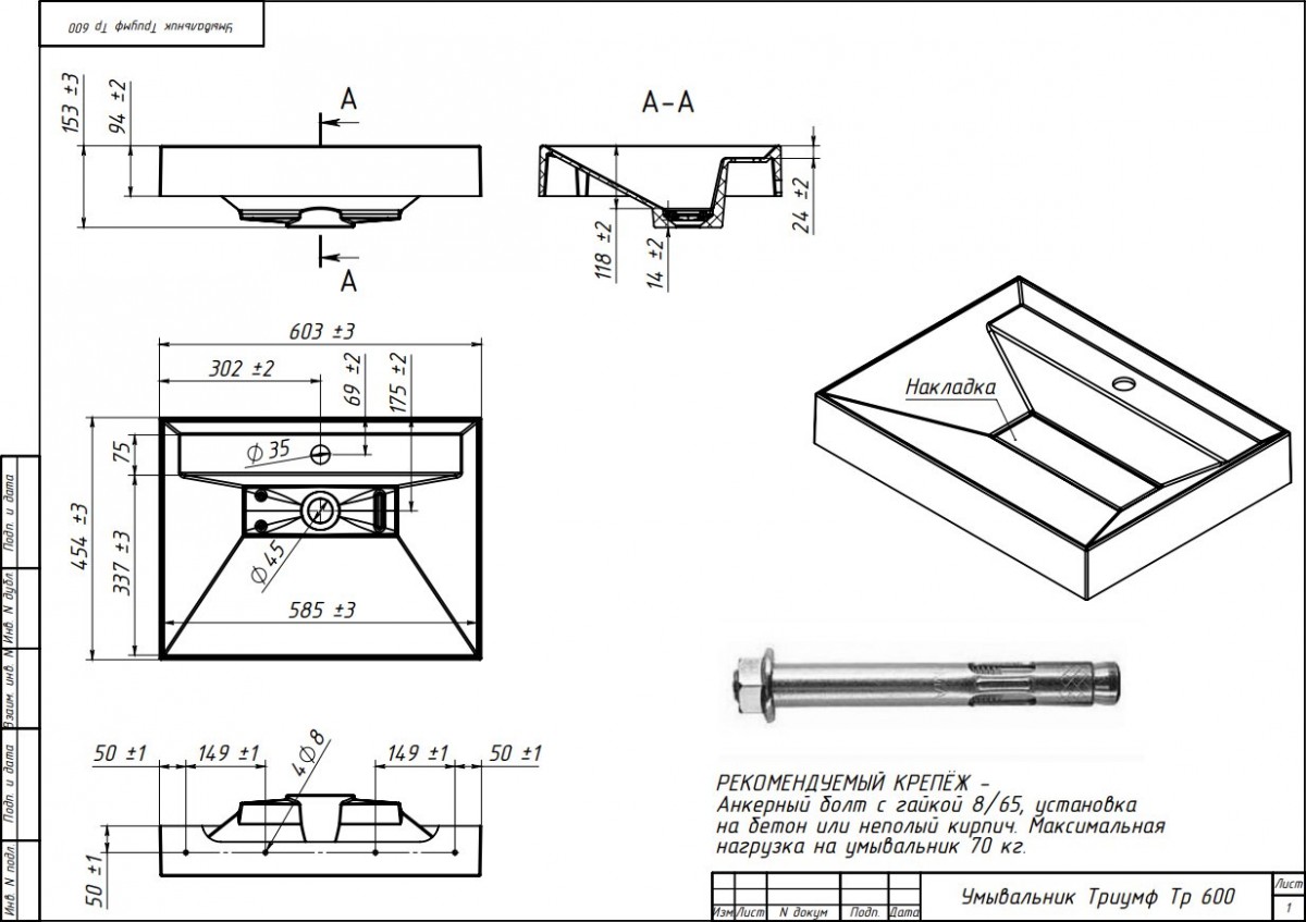 Умывальник Белюкс Триумф 600 белый, без отверстия под смеситель - Ширина: 60.3 см, Глубина: 45.4 см, Конструкция: На тумбу, Материал: Искусственный камень, Цвет: Белый