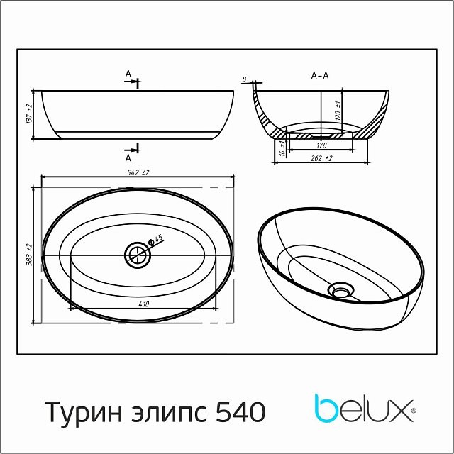 Умывальник Белюкс Турин 540 Эллипс 54x38 белый