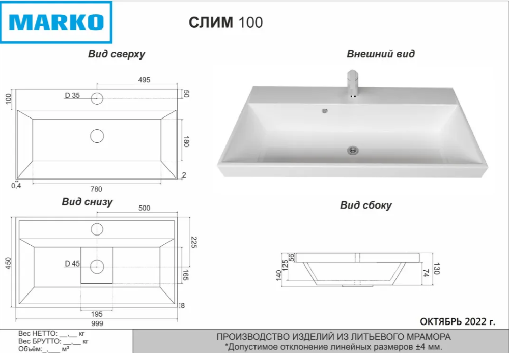 Умывальник Marko Слим 100x45 белый