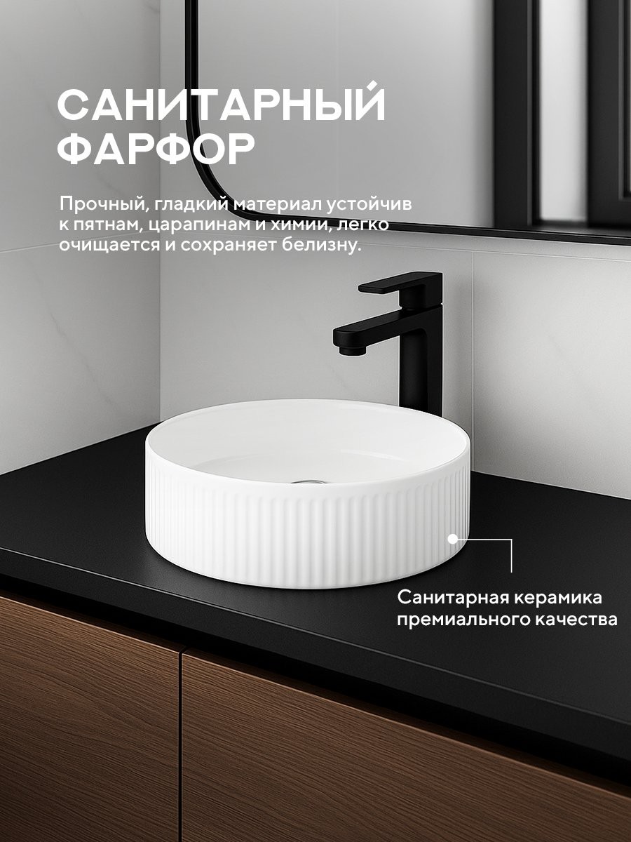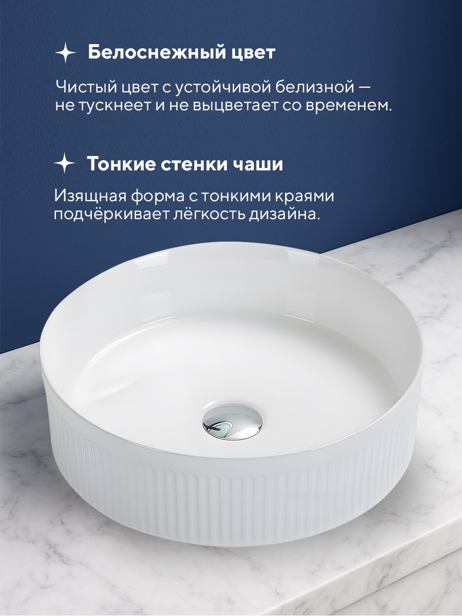 Фарфор, из которого изготовлены раковины, сохраняет свой привлекательный внешний вид даже при длительном использовании.