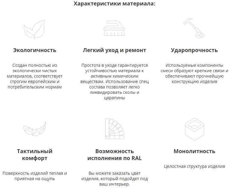 - Легкий уход и ремонт. Простота в уходе гарантируется устойчивостью материала к активным химическим веществам. Благодаря монолитности изделия небольшие сколы и царапины легко можно устранить в домашних условиях, используя наждачную бумагу.