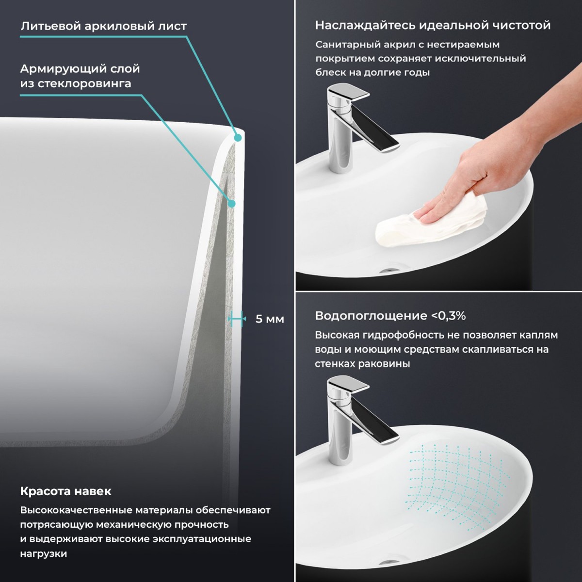 В отличие от раковин из керамики или искусственного камня, гидрофобность и высокий коэффициент плотности акрилового материала гарантируют износостойкость и долговечность раковин Wellsee с приоритетом на безупречную гигиеничность и функциональность. Гладкая беспористая поверхность акриловых раковин не накапливает бактерии, известковый налет и не требует тщательного ухода, тактильно приятная и легко поддается реставрации. Повышенная стойкость к истиранию, выцветанию и желтизне сохранит эстетичный внешний вид изделия долгие годы.