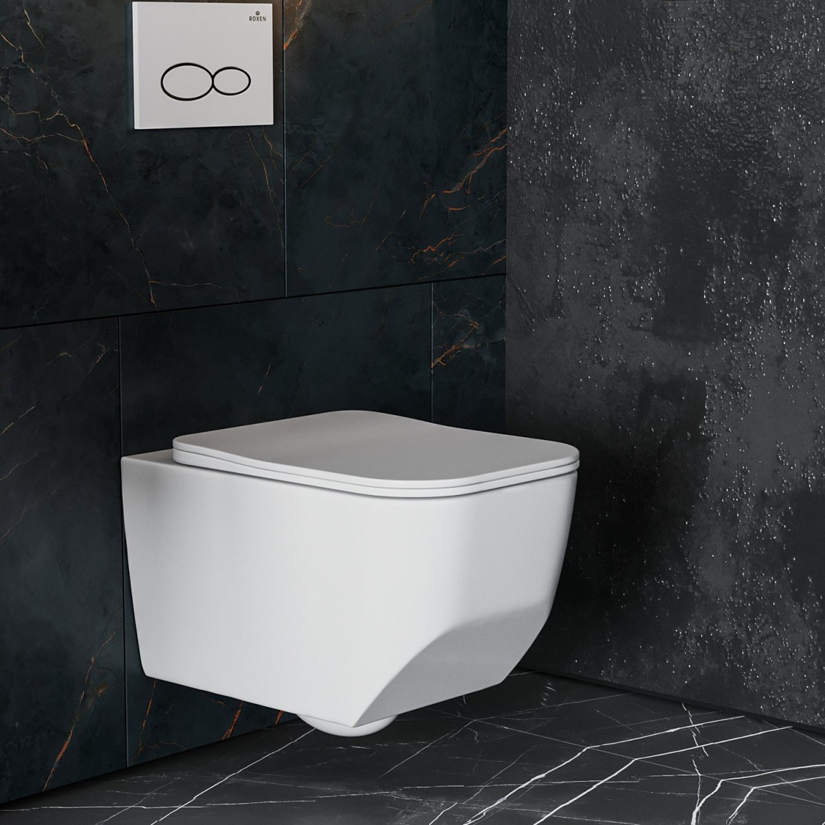 Подвесной унитаз Roxen Boro 530145-01 Rimless Soft Close - стильная оригинальная модель с удобной безободковой чашей Pro-Rimless, благодаря чему нет труднодоступных зон для уборки. Инновационная конструкция чаши унитаза позволяет избежать попадания брызг воды при смыве. Изготовлен из санитарного фарфора Porcelain, который обеспечивает прочность изделия, белизну, абсолютно гладкую поверхность, отсутствие пор и углублений. Специальное антибактериальное покрытие Ultra Glide обеспечивает легкий уход, гигиеничность и первоначальный внешний вид на долгие годы. Модель укомплектована тонким быстросъемным сиденьем с крышкой Soft Close (плавное опускание). Установка на инсталляцию.