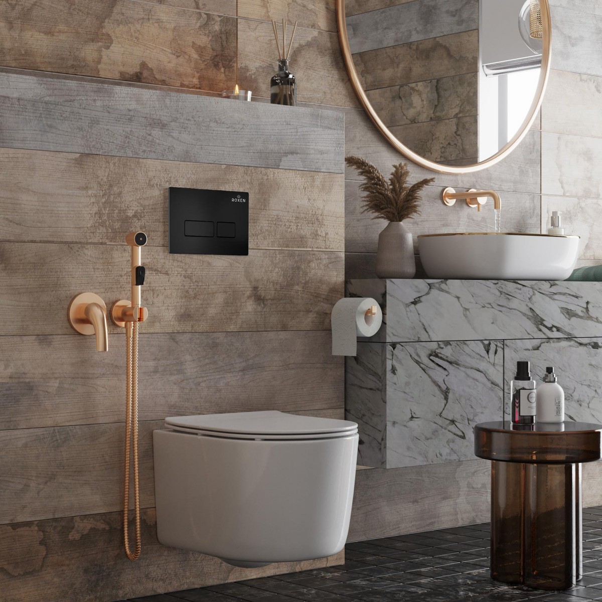 Комплект инсталляции 6 в 1 Roxen StounFix Dual Fresh 921358 с унитазом 530120-01 и клавишей смыва Caspia 410280B саромадозатором