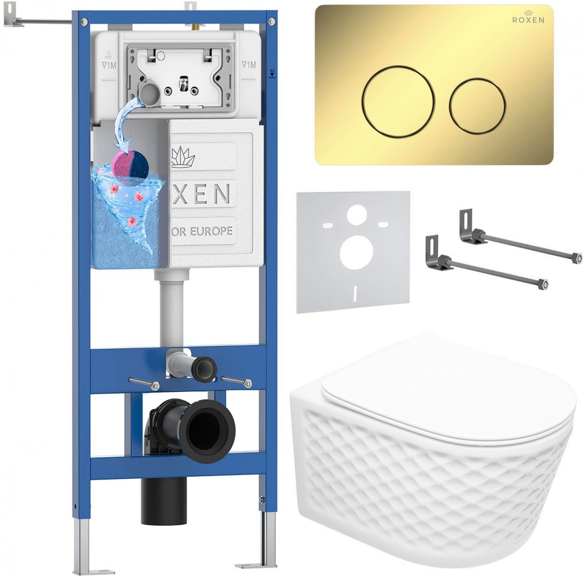 Комплект инсталляции Roxen 6 в 1 StounFix Dual Fresh 868488 клавиша золото - Ширина: 50 см, Высота: 114 см, Глубина: 12 см, панель смыва в комплекте