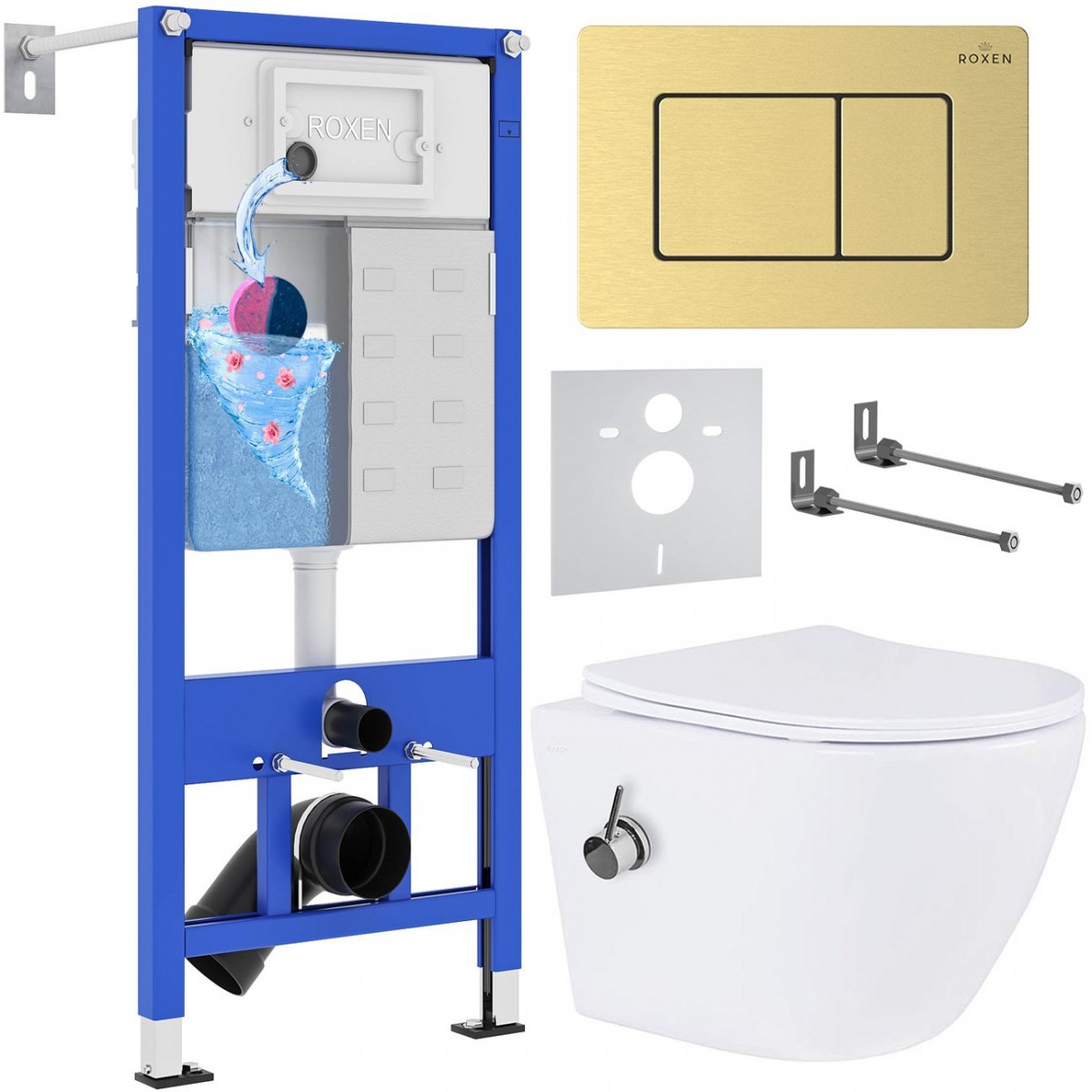 Комплект инсталляция Roxen StounFix Dual Fresh 6 в 1 968457 с унитазом Antares Bidet 530185-01X и клавишей смыва Steel 420280GB брашированное золото