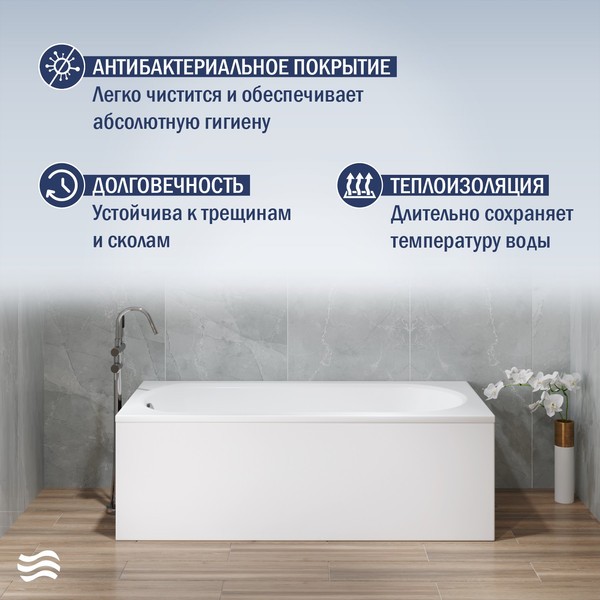Акрил обладает превосходными полировочными свойствами, что позволяет поддерживать идеальный блеск поверхности ванны на протяжении всего срока ее службы. Поверхность ванны покрыта антибактериальным слоем, который облегчает уход и сохраняет первоначальный белый цвет.
