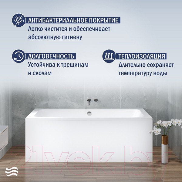 Идеальная глянцевая поверхность ванны покрыта антибактериальным слоем, легко моется и держит белый цвет. Ванна не содержит опасных веществ, или биоцидов. Продукт соответствует требованиям международной организации по стандартизации качества ISO 9001: 2005-10.