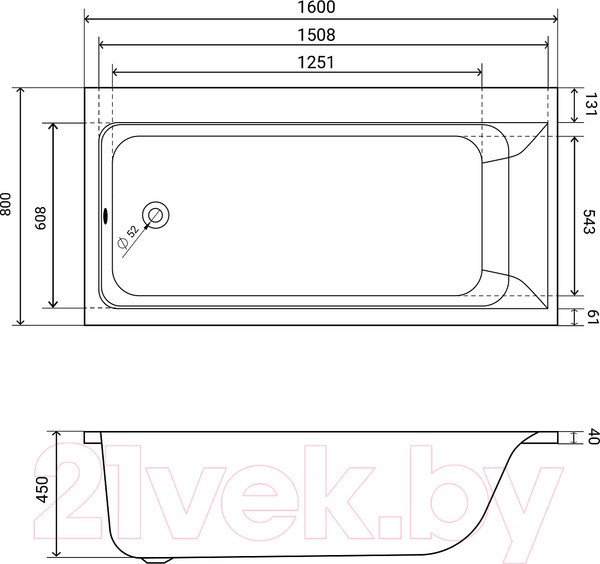 - Боковое сливное отверстие диаметром 5.2 см.