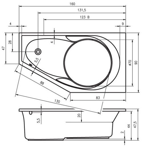 - Размер ванны (Д.;Ш.;В., см.): 160x90x48