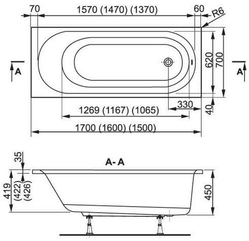 - Размер ванны (Д.;Ш.;В., см.): 170x70x45
