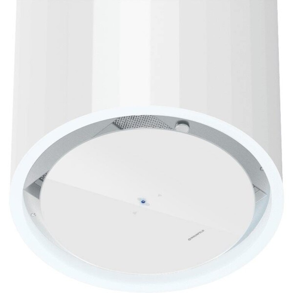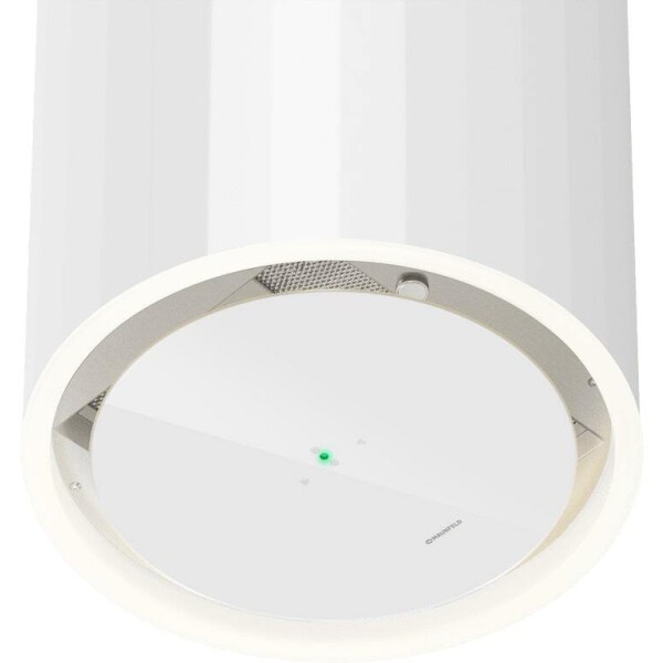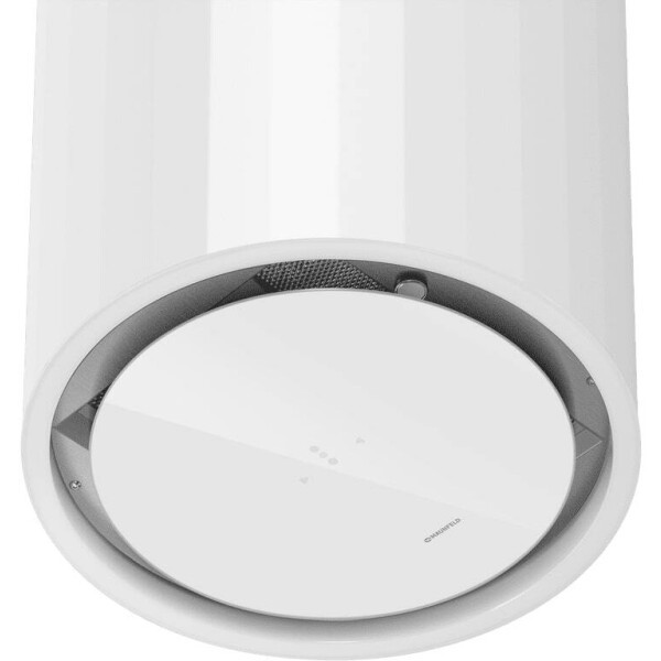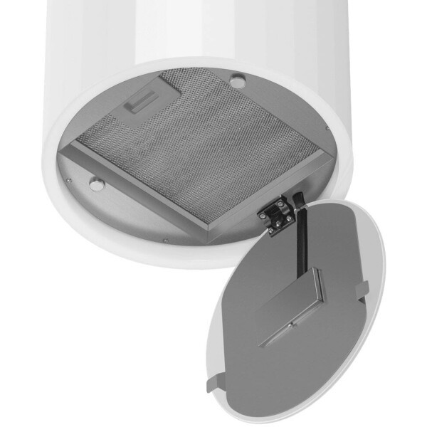 Интерьерная вытяжка в стиле «современная классика». Корпус вытяжки напоминает античную колонну с вертикальным профильным сечением. Дизайн вытяжки эффектно выделяется рельефными полосами вдоль цилиндрического корпуса и запоминающейся стеклянной панелью управления, выполненной в соответствии со всеми тенденциями рынка бытовой техники. Необычная вытяжка благодаря стильному исполнению и техническим характеристикам идеально впишется в интерьер любой современной кухни. Если вы считали, что вытяжка не должна выделяться в интерьере, то после знакомства с данной моделью вы наверняка поменяете свое мнение. Это вытяжка цилиндрической формы, в которой стиль и элегантность сочетаются с высокой производительностью.Можно устанавливать на островной кухне. Корпус цилиндрической формы, выполненный из металла с термостойким покрытием, крепится на потолок над поверхностью плиты. В нижней части вытяжки находится алюминиевый многослойный жироулавливающий фильтр. Он легко вынимается и полностью разбирается, что сильно упрощает чистку.Управление вытяжкой осуществляется с помощью жеста руки или пульта дистанционного управления. Это делает использование вытяжки максимально удобным и простым.Вытяжка со стеклянной панелью управления станет истинным украшением вашей кухни и облегчит уход. Механическое управление с подсветкой позволит выбрать один из 4-х режимов работы вентилятора и включить LED освещение. Тихая работа и высокая эффективность вытяжки обеспечиваются особой конструкцией. Телескопический корпус вытяжки позволяет легко изменить высоту вытяжки при монтаже. Рекомендуемая площадь (высота 2.6 м) до 30 м².Работа вытяжки контролируется двумя способами: при помощи пульта или жестами. Инновационная система управления жестом позволяет полностью контролировать устройство движением руки. Всего 3 жеста достаточно для того, чтобы вытяжка полностью выполняла свои функции. Можно выбрать один из 4-х режимов работы и включить LED освещение. Устройство оснащено цветной светодиодной подсветкой, информирующей о текущей скорости вращения вентилятора. Скорость 1 (низкая): подсветка зеленого цвета, скорость 2 (средняя): подсветка синего цвета, скорость 3 (высокая): подсветка розового цвета, скорость 4 (повышенная): подсветка красного цвета.