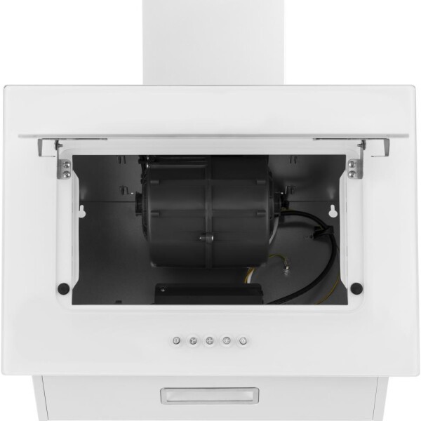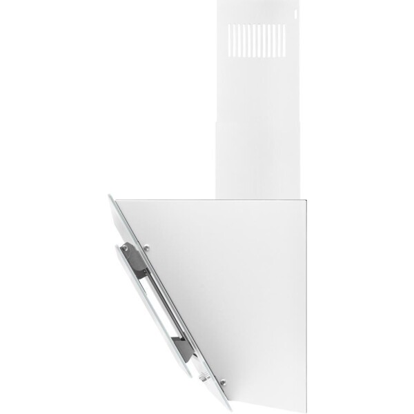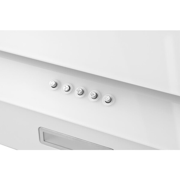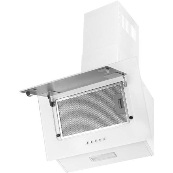 Изящная, элегантная и при этом мощная наклонная вытяжка от шириной всего 50 см, выполненная в сочетании металла и стекла белого цвета, способная работать как в режиме отвода, так и в режиме рециркуляции, станет универсальной и стильной помощницей в интерьере вашей кухни.