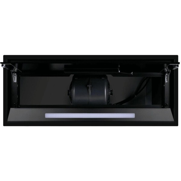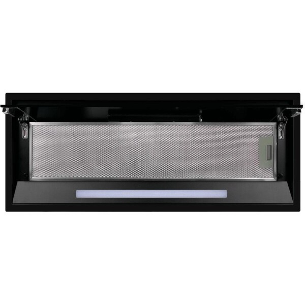 Фронтальная панель выполнена из нержавеющей стали с высококачественным покрытием черного цвета. За откидной панелью из глянцевого закаленного стекла находится многослойный жироулавливающий фильтр, который легко вынимается и полностью разбирается, что сильно упрощает чистку.